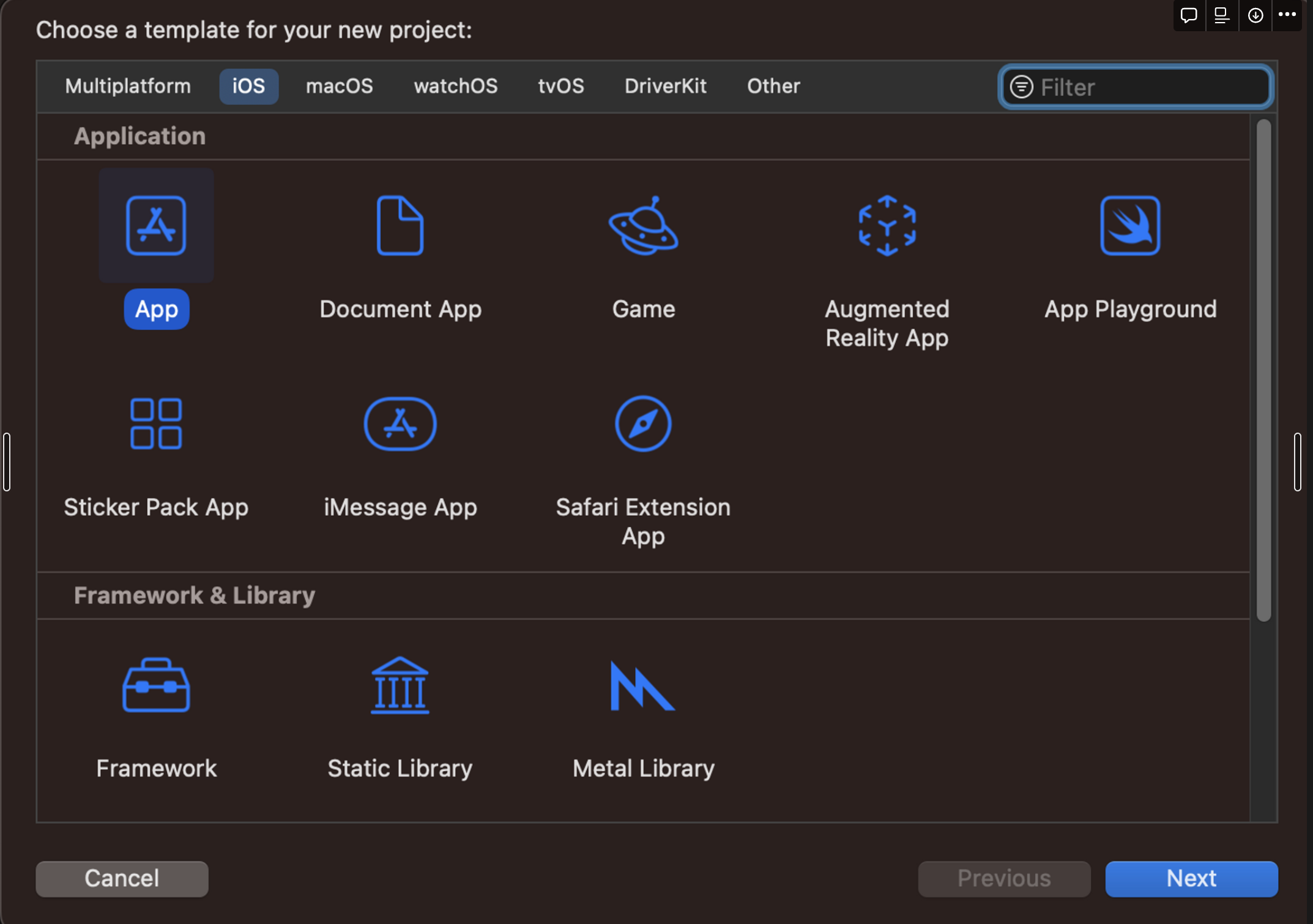 For **Non-AR**: Select `iOS -> App` and click `next`.