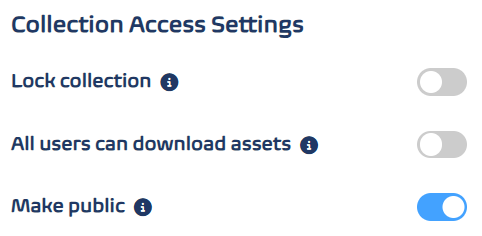 Toggle the buttons at the bottom of the screen to **lock all the assets** in the collection, set whether the collection is **public** or **private**, and set whether viewers are **allowed to download** **assets**.