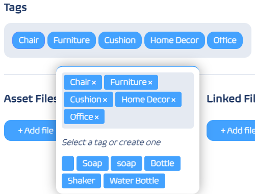 You can view and add **asset files**, such as textures and materials, that are associated with the asset.